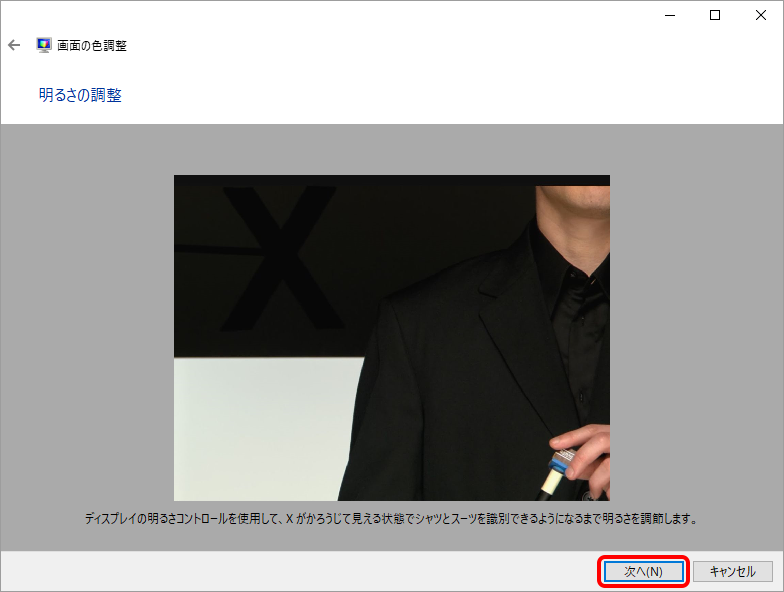 6明るさを調整します。指示に従い、背景の「X」がかろうじて見え、さらにシャツとスーツの明るさの違いがわからない程度にモニター本体の明るさ調整機能を使って調整します。終わったら「次へ」をクリックします。