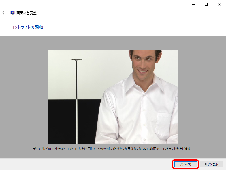 7コントラストを調整します。指示に従い、シャツのボタンとしわが見えなくなる程度にモニター本体のコントラスト調整機能を使って調整します。終わったら「次へ」をクリックします。