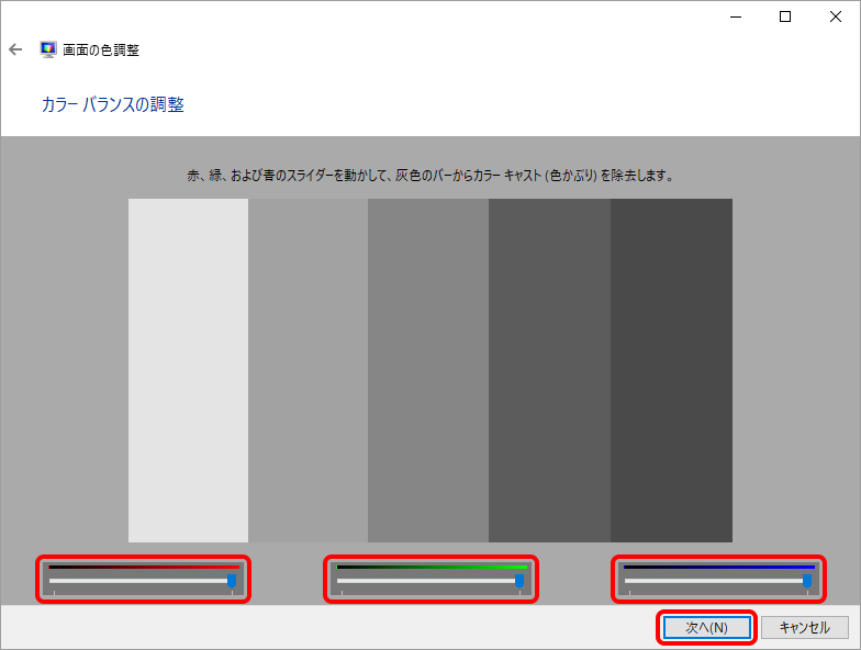 8「カラーバランスの調整」画面では、3つの左右のスライダー(左からR、G、B)を動かして、表示されている濃淡のあるそれぞれのグレーが無彩色になるようにします。終わったら「次へ」をクリックします。