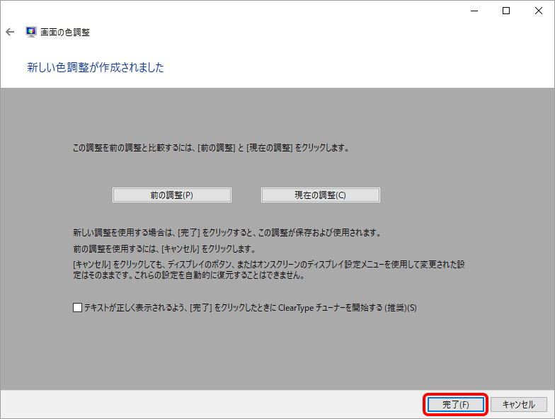 9作業の終了です。調整前後の状態を比べるには「前の調整」ボタンと「現在の調整」ボタンをクリックします。最後に完了ボタンをクリックして、「画面の色調整」を終えます。