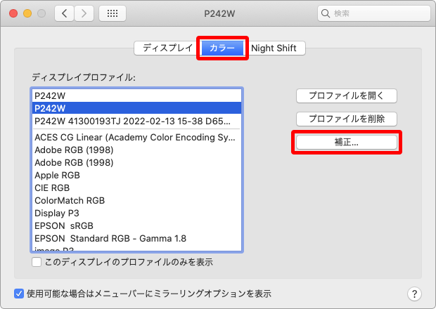 1「システム環境設定」で「ディスプレイ」を選び「カラー」タブを選んだら、「補正」ボタンをクリックします。