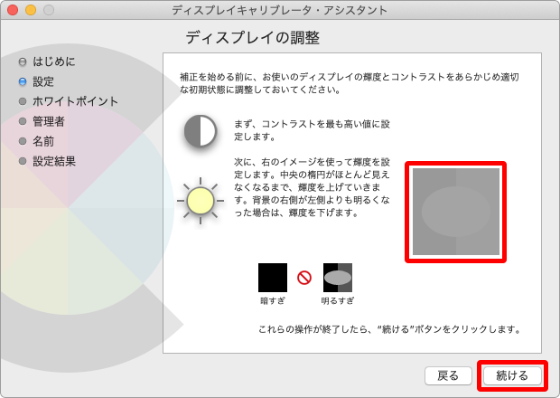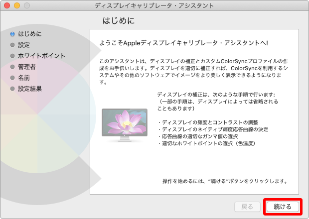 2「ディスプレイキャリブレーションアシスタント」の画面に変わったら「続ける」をクリックします。