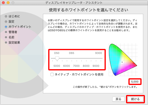 4スライダーを動かして色温度を指定します。プリント向けに5,000とします。