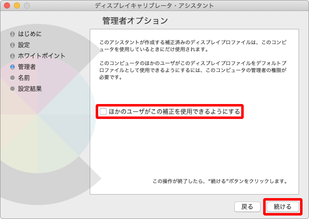 5作成するキャリブレーションデータ(ICCプロファイル)を利用できるアカウントの権限を設定します。複数人でMacを使うために複数のアカウントを作成している場合、誰もがこのICCプロファイルを利用できるようにするには、赤枠部分にチェックを入れます。「続ける」をクリックします。