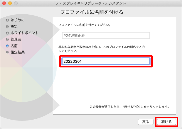 7指示に従い作成するICCプロファイルの別名を入力し「続ける」をクリックします。