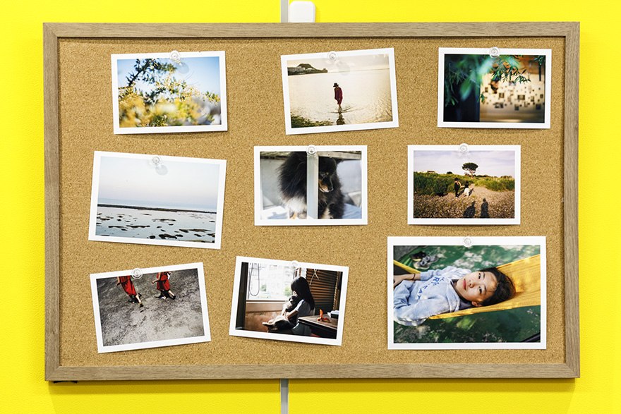 最も手軽にプリント写真を飾る方法が、壁へのピン留め。壁にピンを刺せないのであればコルクボードなどを利用すればいいでしょう。たくさん写真を貼ると、部屋がにぎやかになりますよ。