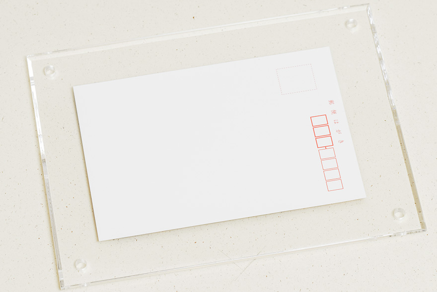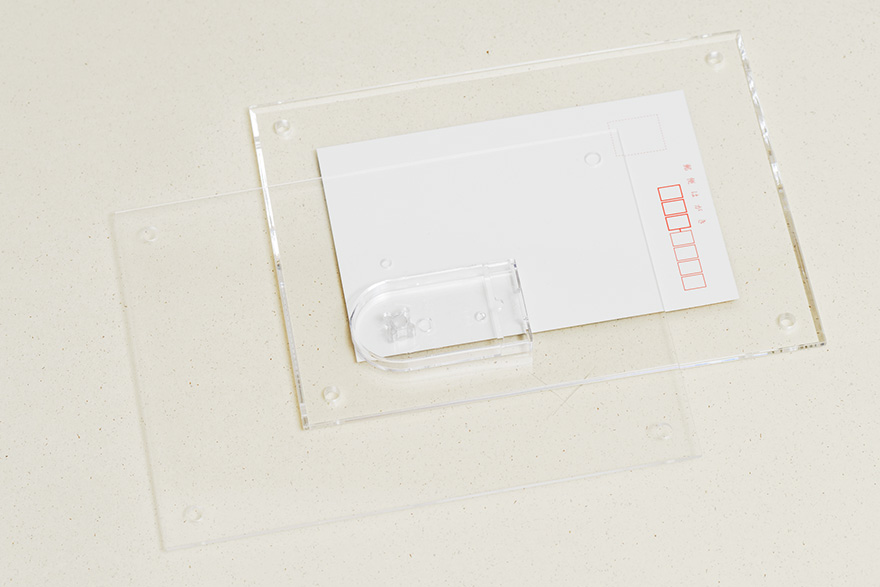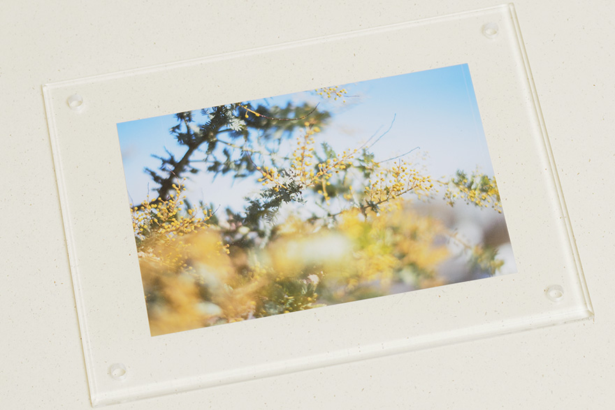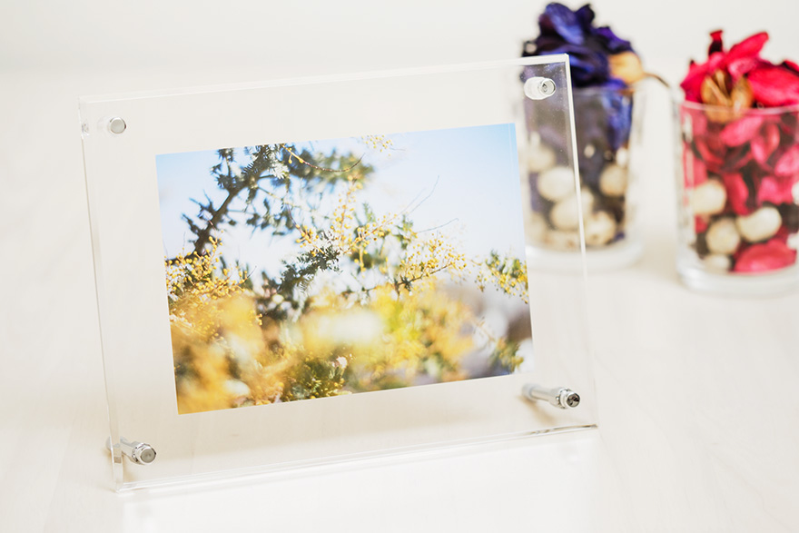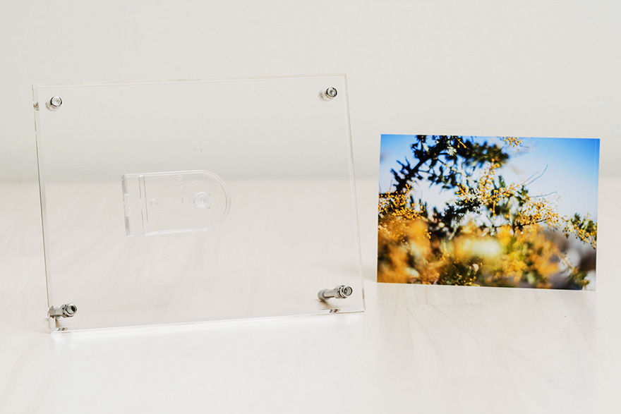 2枚のアクリル板でプリントを挟むタイプのフォトフレーム。掲載の写真はハガキサイズ用。2枚のアクリル板をネジで止めているだけなので、プリントをセットするのも簡単です。