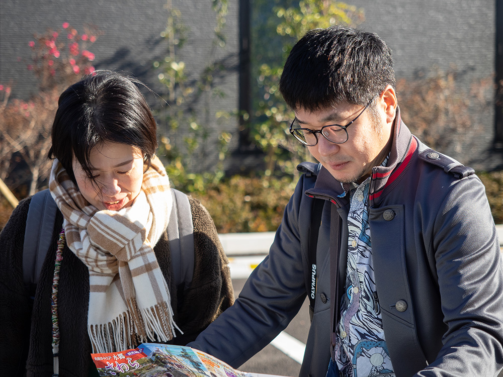 「こう撮りましょう」と提案はせず、まずは自由な撮影を促すのが清水さんのスタイル。前山さんもスナップ撮影に慣れているため、撮り方などのレクチャーはなし。観光マップを見て大まかな場所を頭に入れ、ノープランのまま撮影はスタート