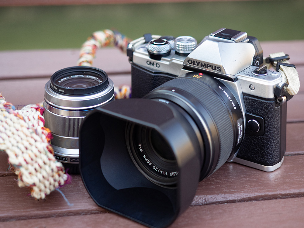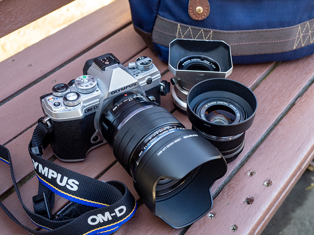 清水さんの撮影機材。カメラはオリンパス「OM-D E-M5 Mark III」。レンズは同「M.ZUIKO DIGITAL ED 17mm F1.2 PRO」、「M.ZUIKO DIGITAL ED 12mm F2.0」、「M.ZUIKO DIGITAL 25mm F1.8」の3本。マイクロフォーサーズ+明るい単焦点レンズという「軽いシステム」が気に入っているという