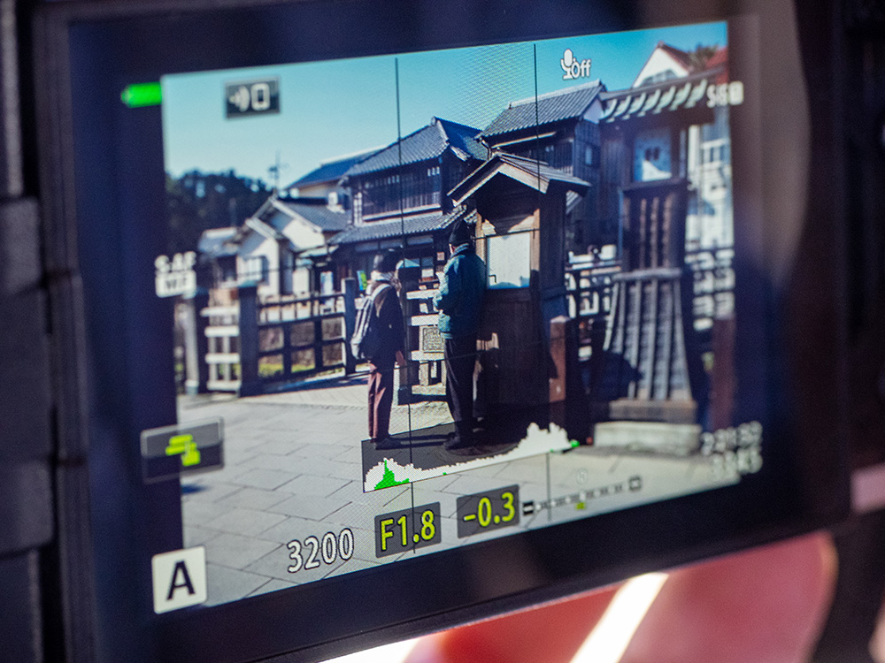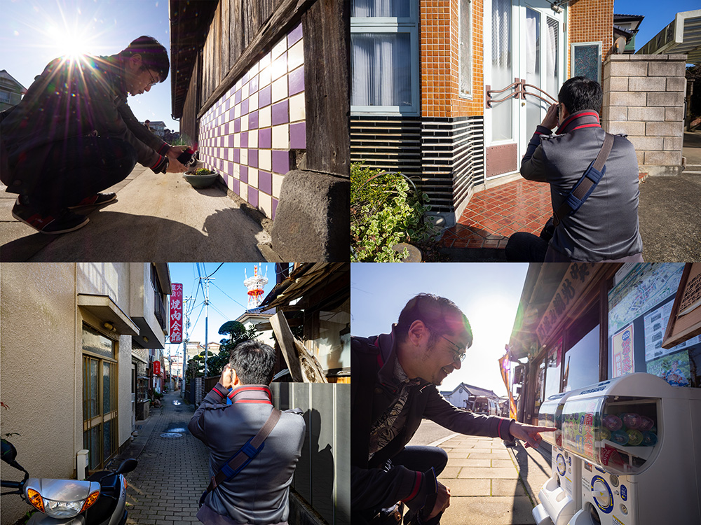 独自の視点で「佐原だから撮れる何か」を探す。心が反応するシーンを見つけては観察を繰り返し、気に入ったスポットでシャッターを切る。ときにはトイカプセルの販売機を見つけ、「これ低すぎでしょ。子供だって低いよ」と喜ぶことも