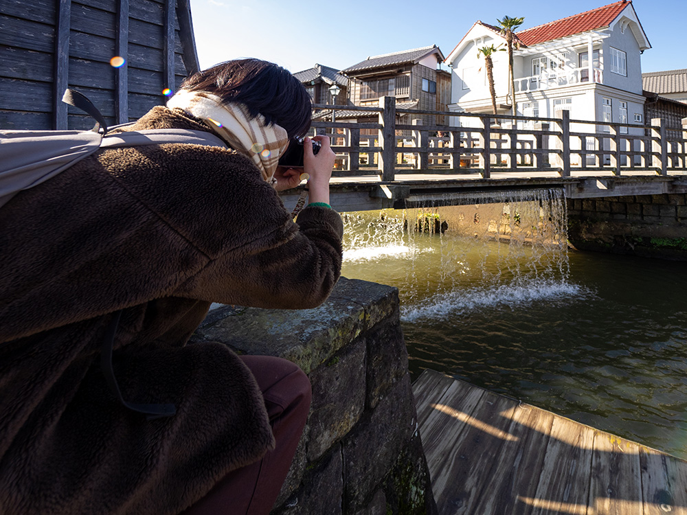 通行人を避けるかどうかは、スナップ写真にとって大切な要素です。そのアドバイスが出たのは、樋橋(通称、ジャージャー橋)を撮影しているときでした。ジャージャー橋は、伊能忠敬記念館の前にある、乗船場に隣接した木製の個性的な橋です。橋の両側から滝のように水が流れ落ちるシーンがとてもフォトジェニック。