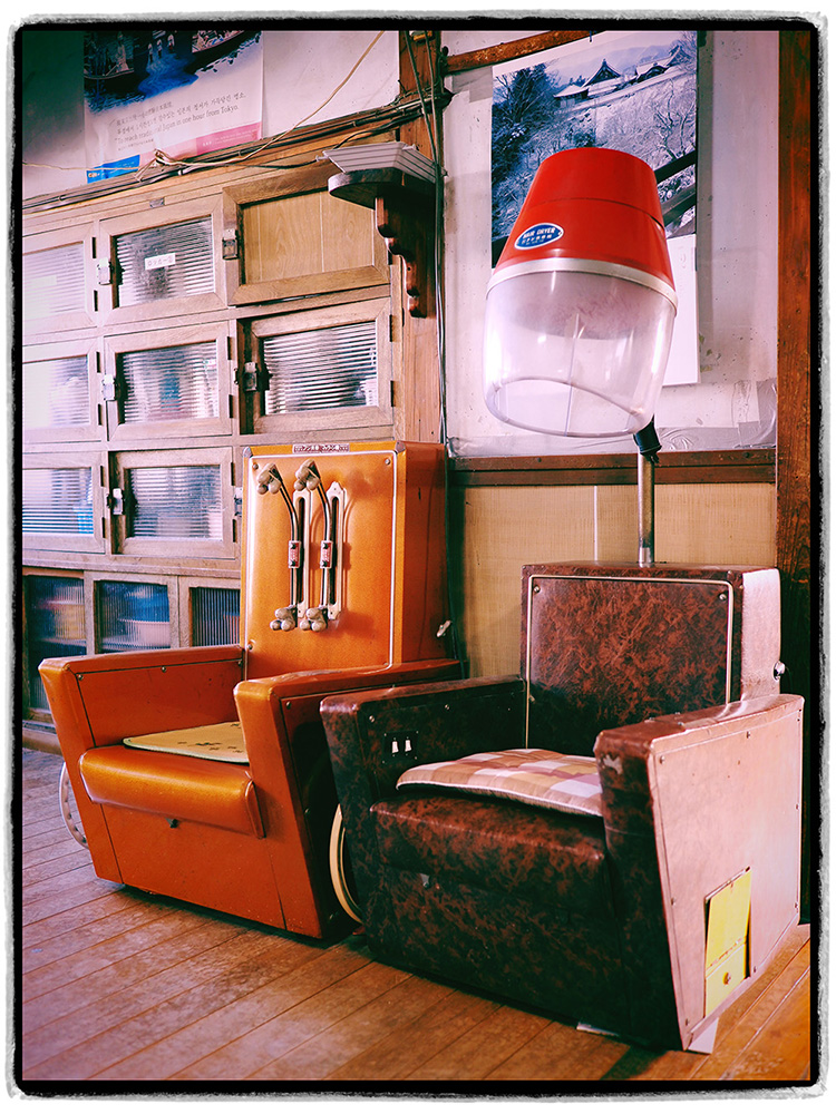 清水:これ、被写体に撮らされちゃうパターンだよね。どこを撮っても映える。もう、ここ大好き! マッサージマシン、すげえ! これ、頭乾かすやつ? この絵はどなたが描いたものなんですか? 丸山さん? 銭湯絵師の? あ、その回しているところ、撮ってもいいですか?