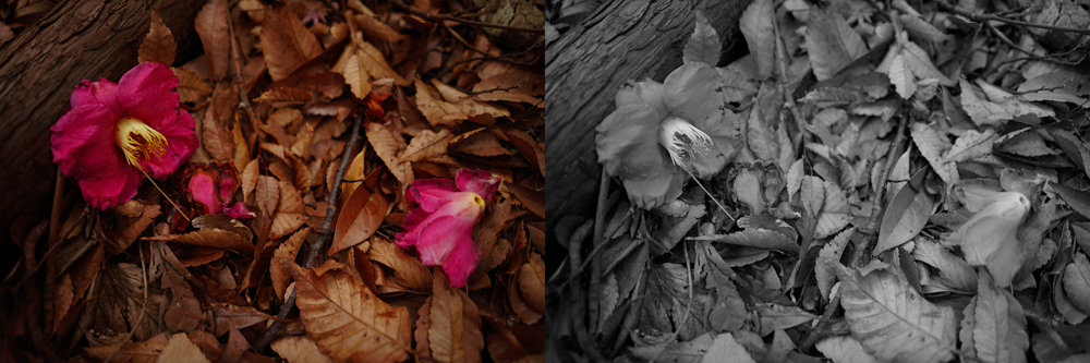 赤い椿の花が枯れ葉に落ちたシーン。カラーでは明確な被写体も、モノクロにすると被写体の分離があいまいになるものもある。