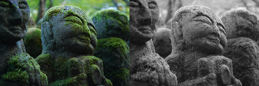 カラーで撮影してモノクロに変換した作品。苔むした歴史を感じさせる風合いがモノクロでは感じられず、単なる石のザラザラとした質感に見えてしまう。表現したかった「歴史の重み」がモノクロでは伝わらない例。