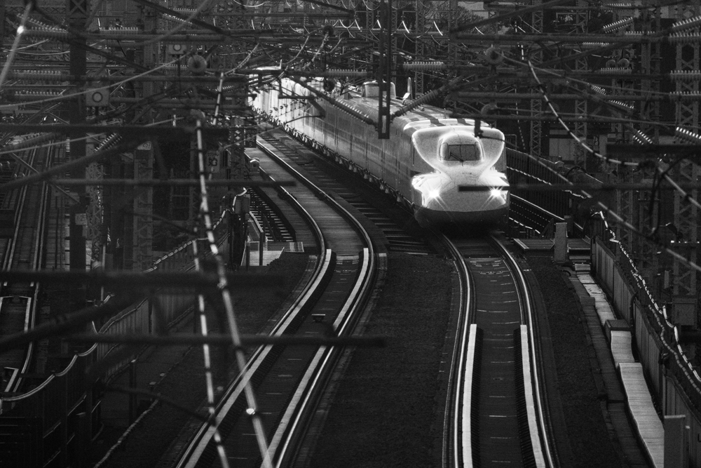 主題としているのは新幹線(ハイライト部分)。暗い中で主題と線路に目が向くため、色を使わなくてもなにを見せたいのかをしっかりと伝えることができる。