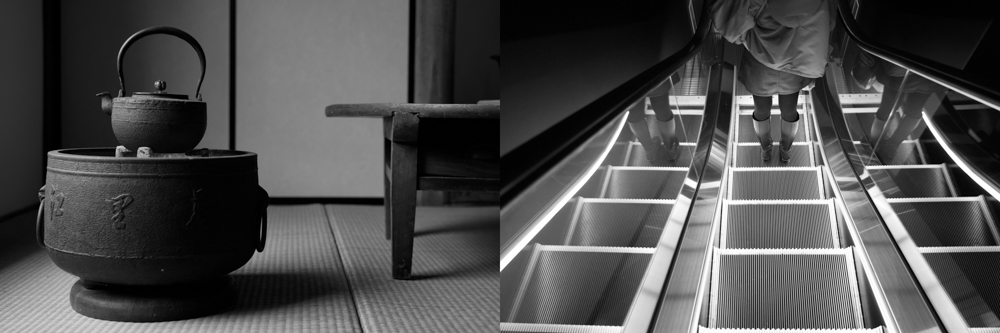 写真左:鉄瓶と畳の質感がモノクロになることで際立っている。対して後ろの襖はフラットな質感のため、モノクロでは主題になりにくい。写真右:エスカレーターの幾何学的な凹凸(右)は、モノクロにするとインパクトが出てくる。