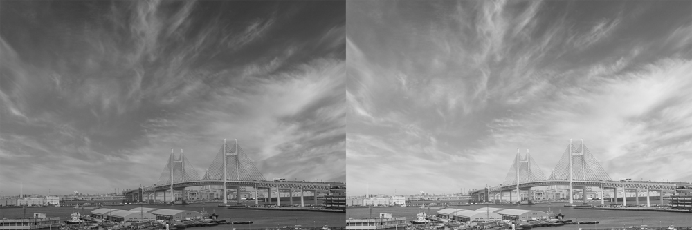 鈴木:下の写真を見てわかるとおり、明るい写りの空はスッキリとした感じですが、暗い空はおどろおどろしい感じがします。このように、明るさの変化でモノクロ写真の印象は一転するので、慎重に決めたいところです。