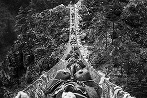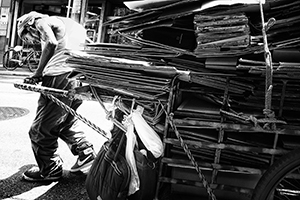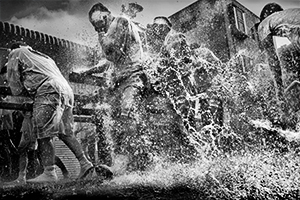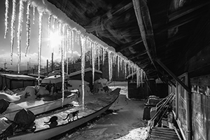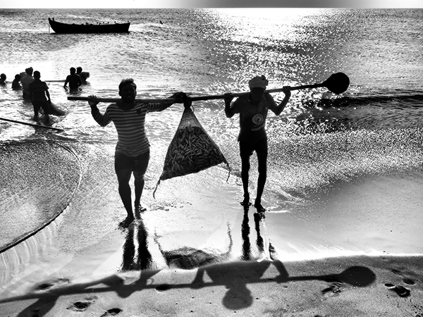 漁師が運ぶ網の中に小魚がたくさん入っている様子を、キラキラとした逆光の海を背景に写すことで、モノクロならではの表現に仕上げています。逆光でありながら、シャドー部が潰れていない点にプリントの上手さを感じます。シンメトリーな構図で安定感があり、水の質感がよく出ているのも素晴らしいと思います。絵画的で美しい作品です。