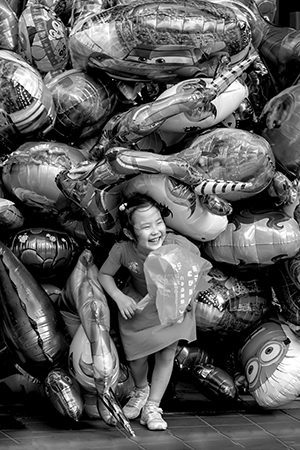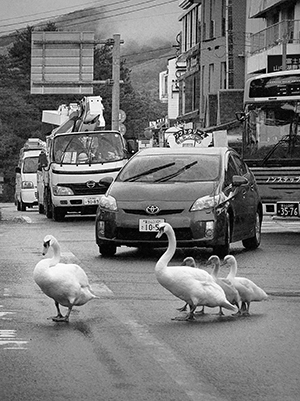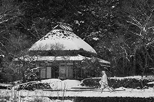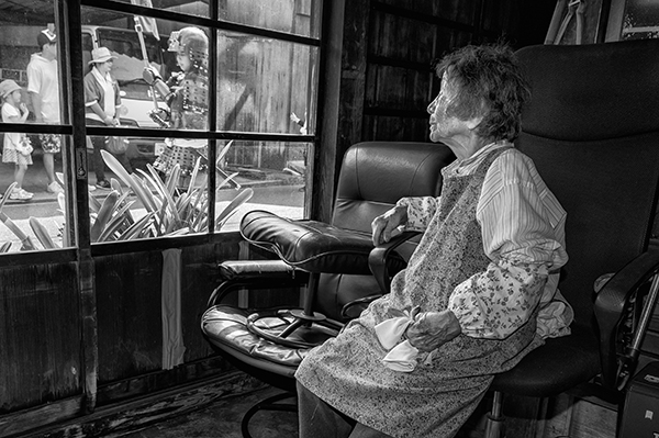 戸外では祭りの行列が歩いている。それを家の中から眺めているお婆さんを写すという手の込んだ作品。窓の外を眺めているお婆さんに存在感があって、写っているのは横顔ですが画面構成上の主役になっています。モノクロのトーンを生かしていて、その屋内のお婆さんにカメラを向けて祭りの日をスナップする。室内も屋外もきれいに描いており、作者の技術力が感じられる作品です。