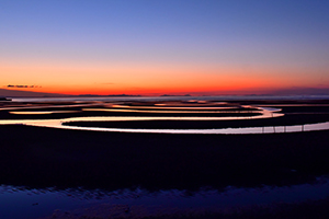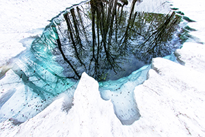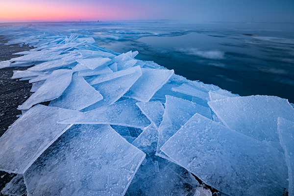 水辺で水面が凍り、それが割れて幾重にも重なっているという自然のエネルギーが映し出された作品です。ともすると平面的な写りになりがちなシーンですが、太陽の光で赤く染まった空を入れることでスケールの大きさや立体感が表現された写真に仕上がっています。結果、空の色と凍った水面の幾何学的な造形により、一層強く自然の力が感じられる作品になっています。