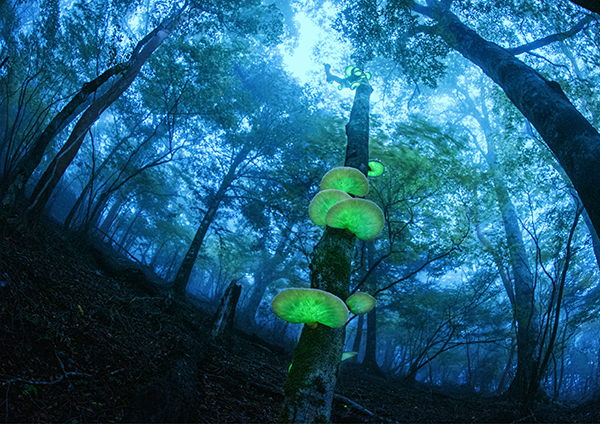 わずかに光がある状況で撮影し、周りの情景を美しく写し込んでいる点が面白いと感じました。魚眼レンズでキノコを大きく見せている点も面白いと思います。また、新型プリンターを用いて、再現の難しい神秘的なブルーの色やシャドー部のグラデーションを再現しているなど、プリンターの特徴を生かして立体感のある完成度の高い作品に仕上げています。