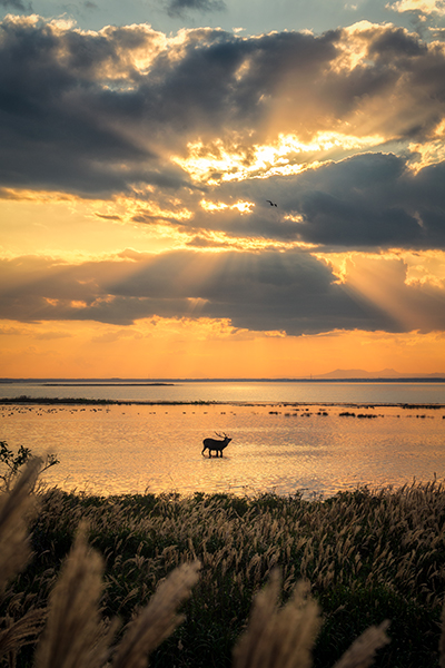 太陽の光芒を背景に鹿が鳴いているさまは、まさに神々しく、素晴らしい風景です。鹿を点景とすることでスケール感が感じられ、構図のバランスの面でも優れています。特に大きなプリントで見ると、神様の存在が感じられるような神々しさが際立って感じられます。プリントはシャドー部の調子が見事で、ナチュラルで美しく仕上がっています。