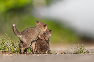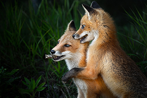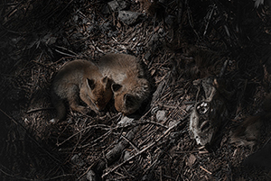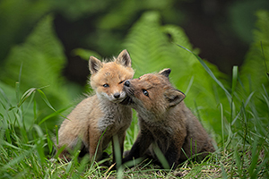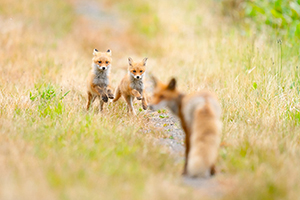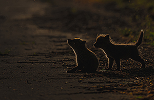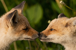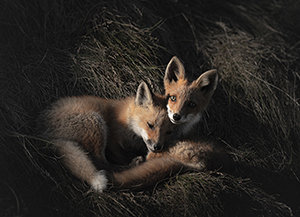 ただ可愛いだけでなく、2頭の子ギツネの愛情や気持ち、作者とのつながりなどが感じられる微笑ましい作品です。子ギツネの様子を丁寧に捉えているのに加え、光の当たり具合なども素晴らしく、感動的でストーリー性が感じられるのは本作の魅力の1つです。プリントは、自然な色合いでコントラストやボケ味などのバランスがよく、リアルな世界観を紡いでいます。プリントサイズが大きく、中にはおよそ原寸大まで大きくプリントされたものもあります。特にこれらの写真は、ふわふわとした毛並みや、眼球に写り込んだ景色までがシャープに描写されていて、世界の広がりや心地よい緊張感が感じられる、極めてクオリティーの高い作品に仕上がっています。