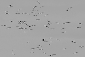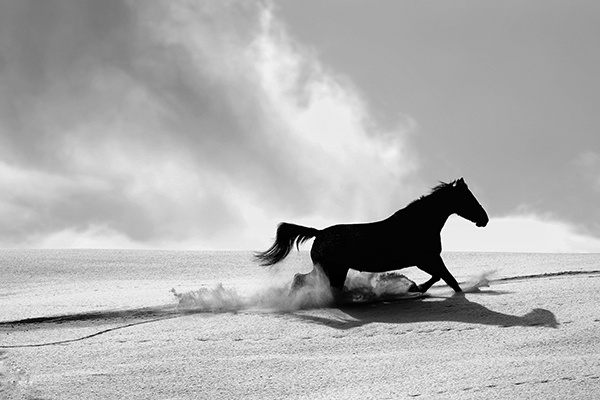 まず、「雪の砂漠」というタイトルがユニークです。これは、本作をモノクロ写真に仕上げたことで、雪原が砂漠に見えてきたために付けたとのこと。タイトルと作品とのマッチングが面白く、雪煙を舞う様子は、確かに馬が砂漠を力強く駆けているシーンが連想されます。馬をあえて真っ黒なシルエットにしたことで、力強く、動きの感じられる作品になっています。背景と、メインの被写体である馬との一体感が感じられる躍動感のある1枚です。