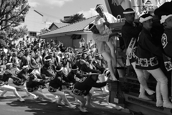 祭りが佳境に入り、皆が盛り上がった一瞬を遠近感を生かした緊張感のあるフレーミングで捉えた作品です。写っている全員の顔の表情が見えているのも、緊張感や興奮が伝わってきて素晴らしいと思います。それに加えて本作は、フィルムで撮ったかのようなザラツキ(粒状感)のある仕上げになっています。これにより、力強さが感じられるのと同時に少しクラシックで、昔撮った祭りのような雰囲気になっていて面白いと思います。