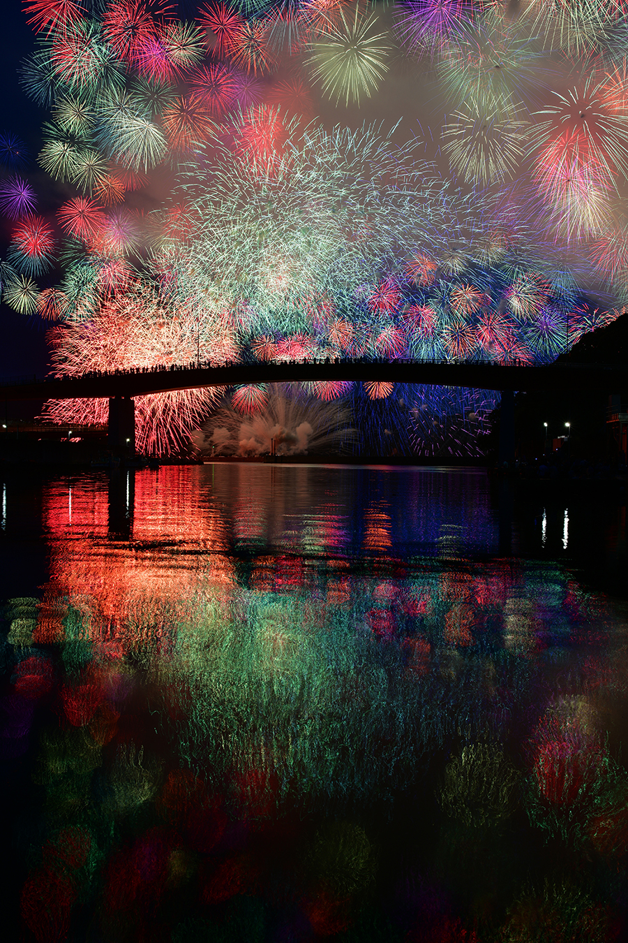 最近の花火大会は、混雑を避けるために橋の上に留まるのが禁止されるケースが増えてきました。とはいえ、多くの人は橋の上から美しい花火を見たいと思っているはずで、本作はそうした多くの人の心の中の花火大会を表現しているようにも感じられます。しかも大きなプリントに仕上げたことで、写真を見ている人も、橋の上から夢見心地で花火を見ているような感覚を味わえるのが面白く、魅力的な作品です。橋を中心に水面の写り込みを活かしてシンメトリックに仕上げているのも、大きなプリントサイズも相まって、本作に最適な表現だと思います。