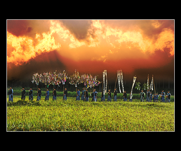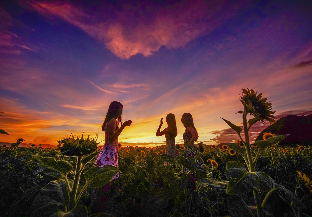 旅行会社の広告ポスターなどに使われそうな、カッコイイ写真です。見ていると旅に行きたくなります。三姉妹のポーズや衣装、夏の夕暮れが上手く作画されています。まずは、夕焼けの見事さが目を引きますが、脇役となっているヒマワリの入れ方もユニークで良いと思います。何より、三姉妹それぞれの手の動きが効果的なアクセントになっているなど、細かい部分にまで気が行き届いていたダイナミックな作品です。色味は少し強調されていますが、シャドウ部の見せ方が上手く、逆光でありながら、三姉妹の衣装の模様も確認できるなど、見どころの多い美しい作品です。