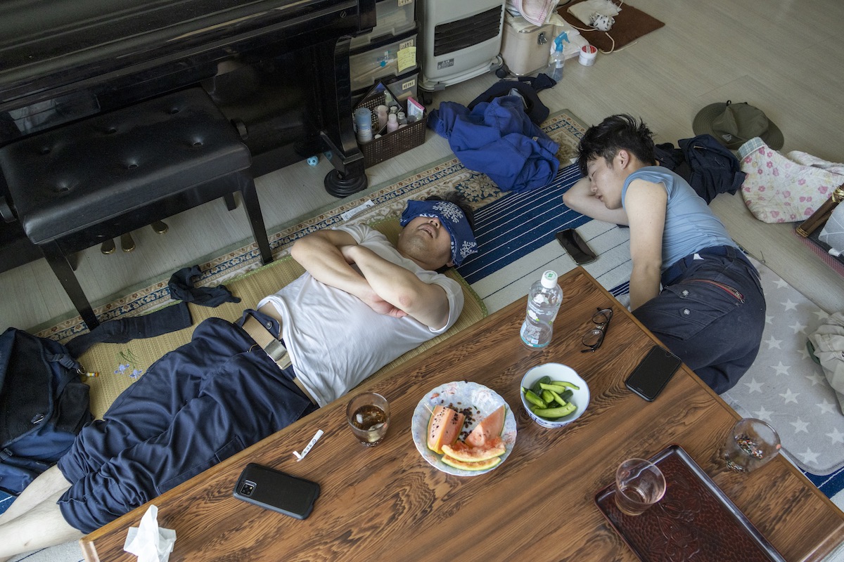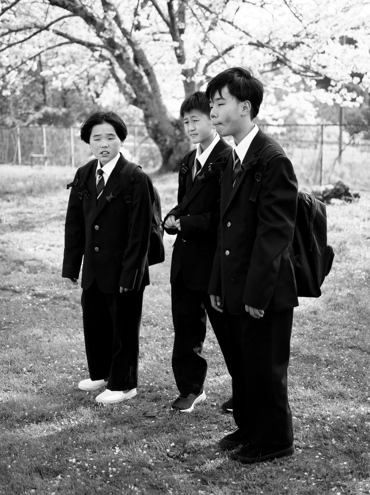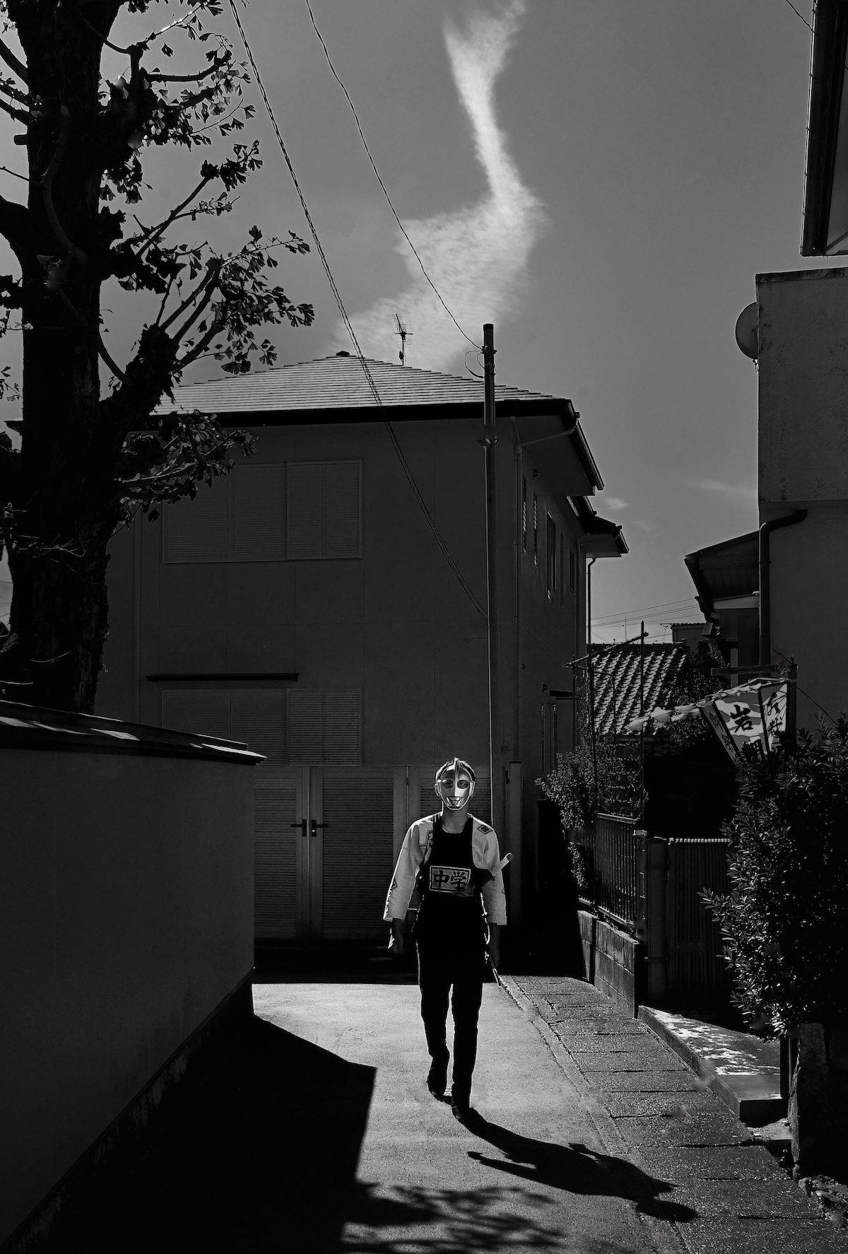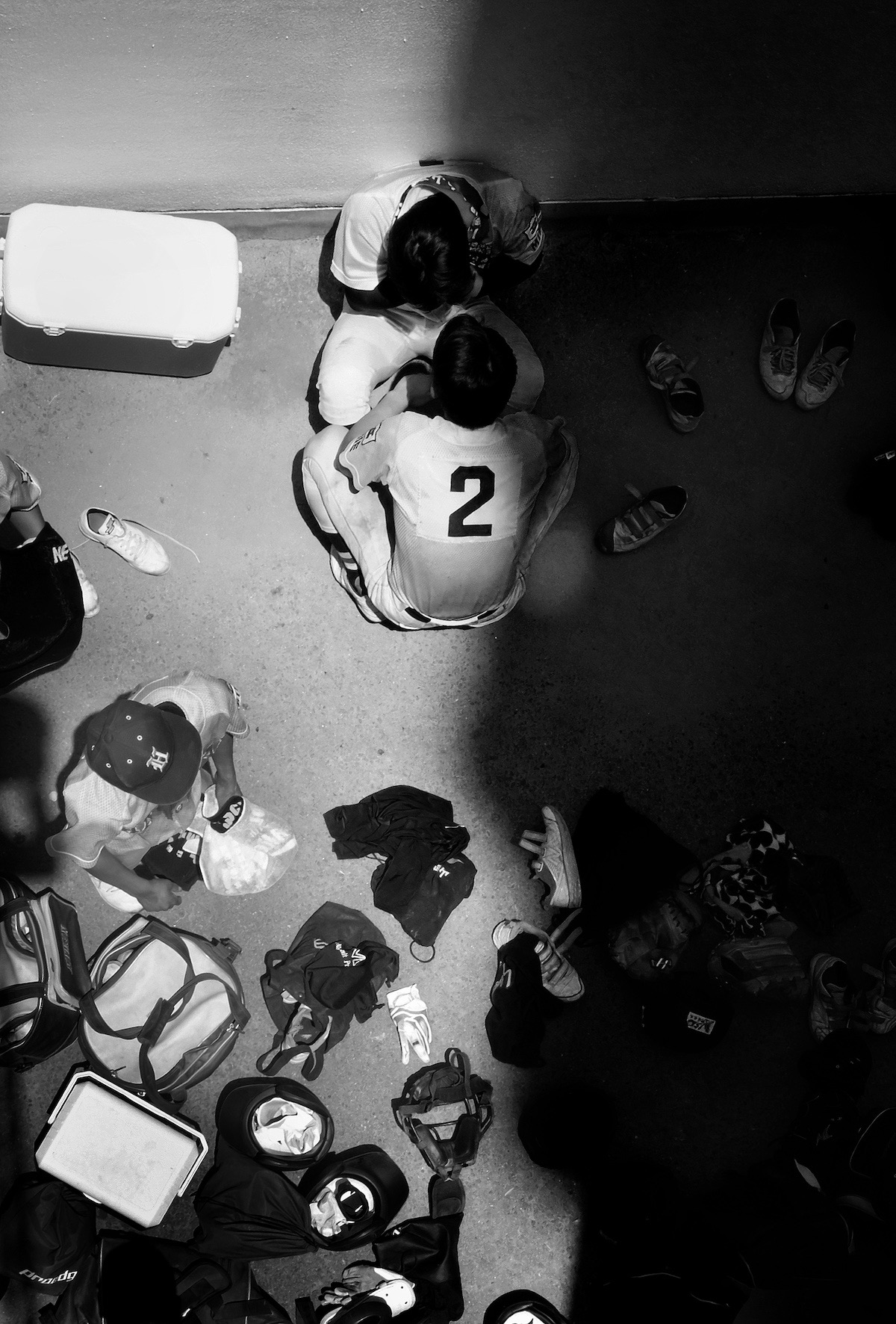 敗戦。キャッチャーが落ち込むピッチャーを慰めているといったドラマが感じられる作品です。おそらく高校野球の青春の1コマでしょう。それを普段はあまり撮らない上からのアングルで静かに撮られています。周囲には靴などの野球用具が雑然と置かれ、バッテリーの会話のみが聞こえてきそうな距離感と臨場感は作品を見る人の想像力を掻き立てます。プリントは、シャドー部がやや暗めですが、その分メリハリが効き、ドラマチックなイメージをよく引き出しています。