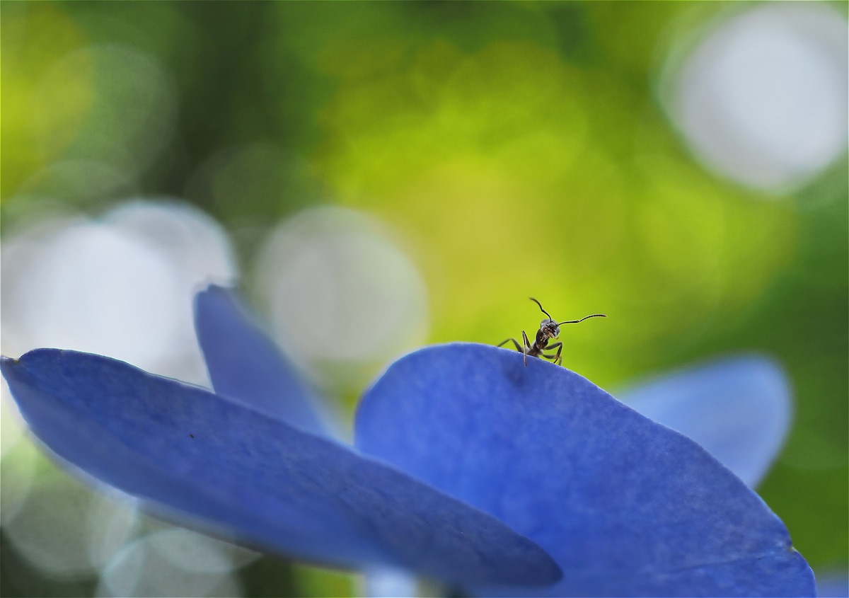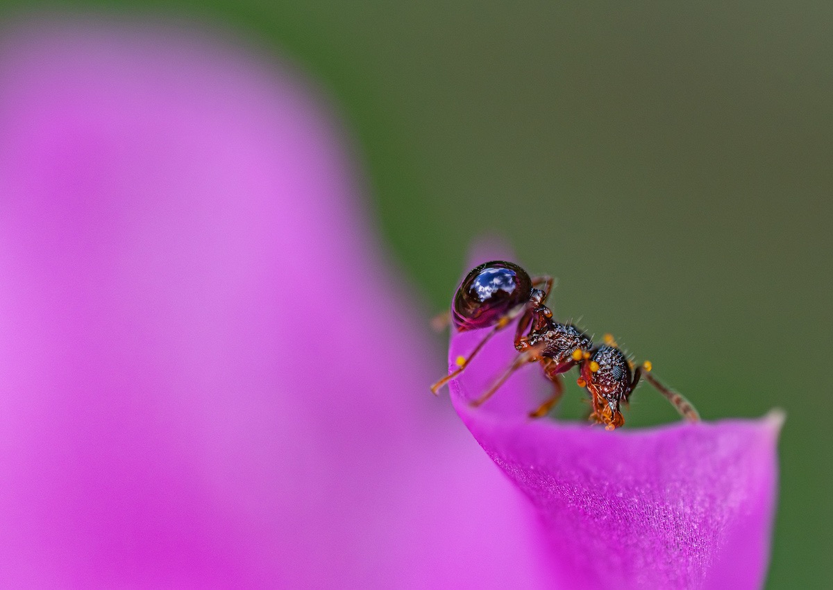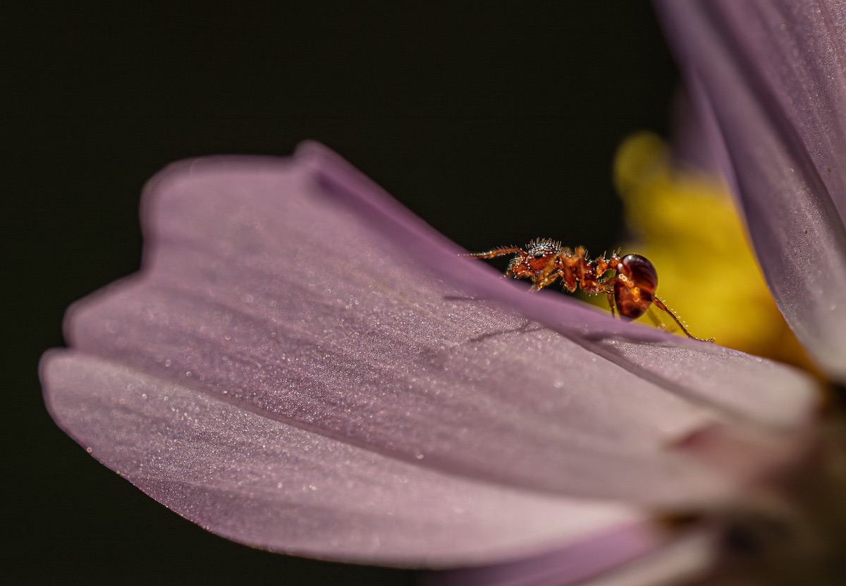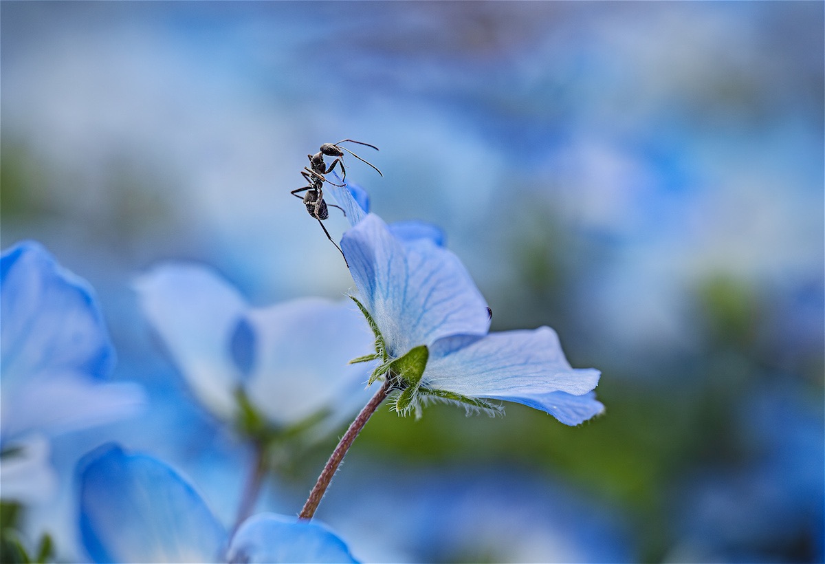 アリが原寸大よりも大きくプリントされているのが面白く、見ている人がアリになったかのように感じられるユニークな作品です。光の扱い方が上手く、逆光で透けたように感じられるのが新鮮。アリの質感描写に優れ、まるでアニメーションで書かれたような色味も個性的です。マクロレンズだけでなく広角レンズも用いられ、画角の違いや寄り引きの差によって独特な世界観を上手く作り出しています。どのようにピントを合わせてシャープに写したのかわかりませんが、その技術力も注目に値します。アリの世界に入り込んで撮っているのが伝わってくる、観察力と情熱に満ちた作品です。