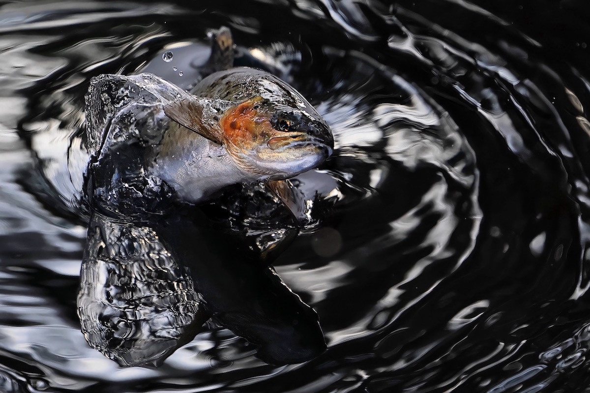 魚が水をかき分けて水面から顔を出したときの瞬間的な動きがリアルに伝わってきて、生き生きとした生物写真になっています。トラウトの茶色の部分や目の金色の光など、ディテールがしっかりと出ていて、フォーカスもしっかりとしています。カメラが100%の力を発揮しただけではなく、作者が写真を撮るタイミングや微かな身体の動きがよく噛み合っています。さらにある種の偶然性。魚の生きる力が上手くスパークしたのではないでしょうか。