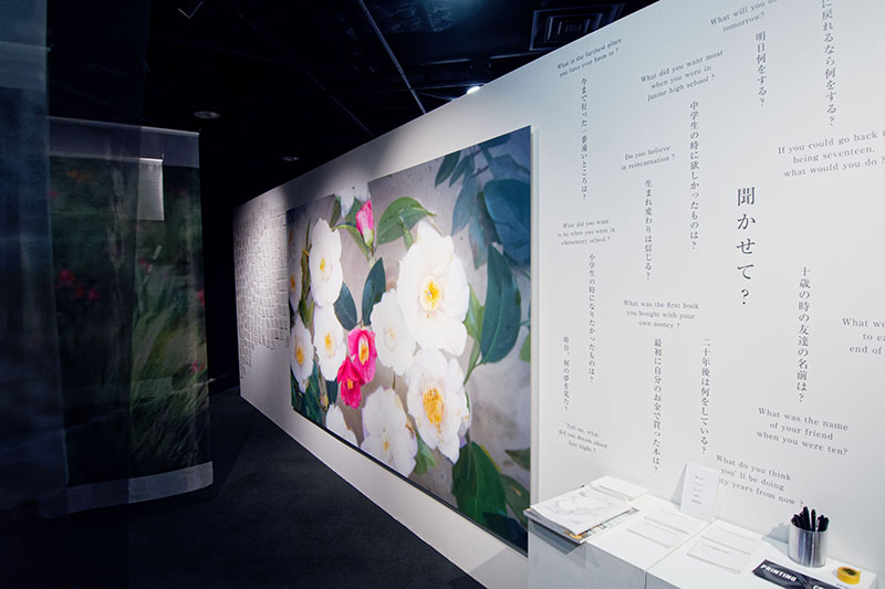渡部さとる氏は、アウトフォーカスのイメージと言葉を組み合わせ、鑑賞者の感情と対話するような作品を、揺らぎのあるオーガンジー素材を用いて表現します。