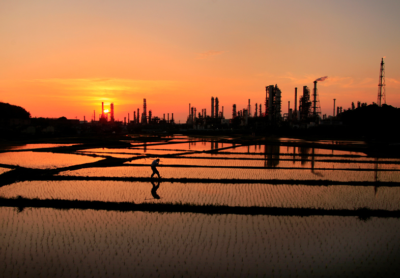 先祖代々守ってきたであろう田園が広がる風景と、自然とは対局に位置する工場のシルエットの対比が、とても印象的な作品です。美しい夕日を映し出す田園が、すべての音を吸い取ってしまったかのような、不思議な静寂も感じます。文化と文明が同居しながらも、殺伐とせず、息を飲むように美しい世界。その風景を、奇をてらうことなく、まっすぐに捉えた構図が、この風景の魅力をダイレクトに伝えてくれているように思いました。