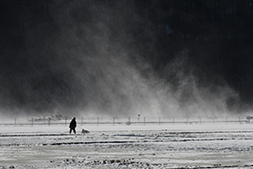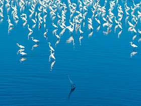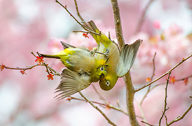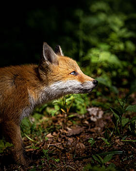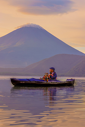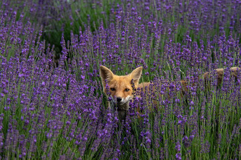 タイトルの「香りに誘われて」の通り、写真からラベンダーの香りが漂うような雰囲気と、カメラをじっと見つめるキタキツネの表情が印象的な一枚です。ラベンダーの花を画面いっぱいに構成し、キタキツネを日の丸構図になるように配置されています。日の丸構図はシンプルに見せたい被写体がストレートに伝わりやすくなりますので、ラベンダーの香りに誘われてやってきたキタキツネのなんとも言えない表情に目のいく一枚です。