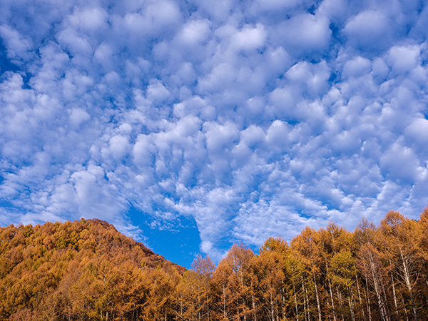 カラマツの黄葉が黄金に輝き、ヒツジ雲が良い演出をしてくれました。空の配分を多くしたことで、清々しい秋を感じることができます。雲の動きが刻々と変化する中、心が動いた瞬間にシャッターを切ることで、良いタイミングで捉えることができました。