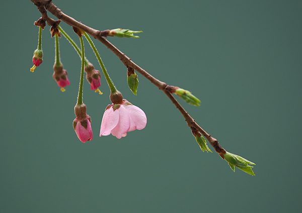 日本画を思わせるすっきりまとまった背景と全体的な色調が淡く、とても美しいです。枝の中で一輪だけが膨らんでいるので、主役もはっきりしていますね。柔らかさはあるのに画像はシャープで花の質感が緻密に再現されています。