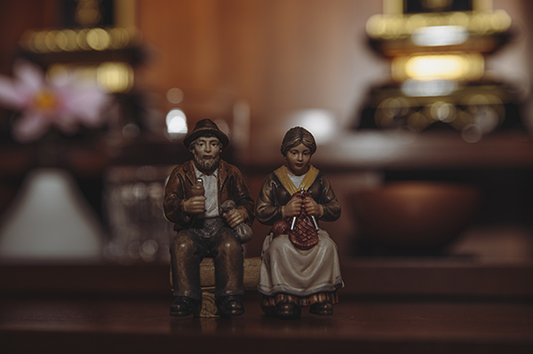 旅先で見つけた夫婦の置きものが、作者に今は亡き両親への想いを沸き起こさせ、位牌の前に置いて撮影した作品。思い出す数々の記憶の中で、ご両親への感謝や恩返しできる方法を作者自ら探求している気持ちが表現されています。