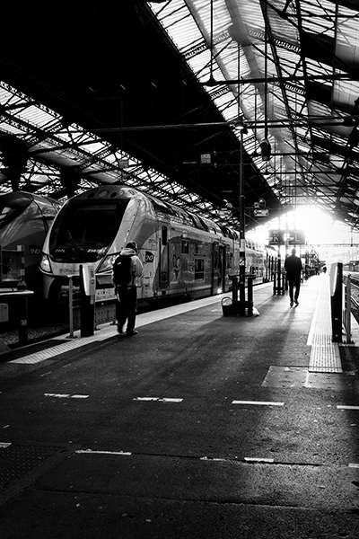 ホームに差し込む朝の光がすごく素敵で、カメラを手に思わず旅に出たくなる1枚です。モノクロームで描き出された光と影のコントラストも印象的。歩く人のシルエットも格好良く決まっていて、絶好のアクセントになっています。