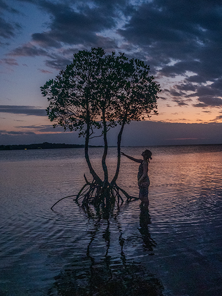 枝ぶりの良い立派なマングローブですね。日暮れの空を背景に、手を添えて言葉を交わしているようなシーンが美しく神秘的です。ゆっくりと時間が流れているような、命の尊さを感じさせてくれる光景です。
