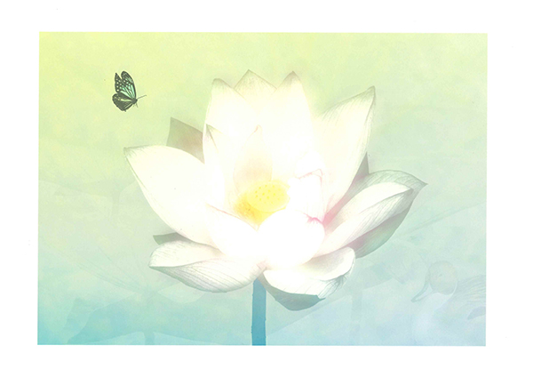 ハスの花がまるで光を放っているかのような神々しい姿。そこに一匹の蝶がやってくるという幻想的な世界が表現されていますね。ハスや水鳥をうっすらと重ね、プリントに奥行きを感じる作品に仕上げられています。