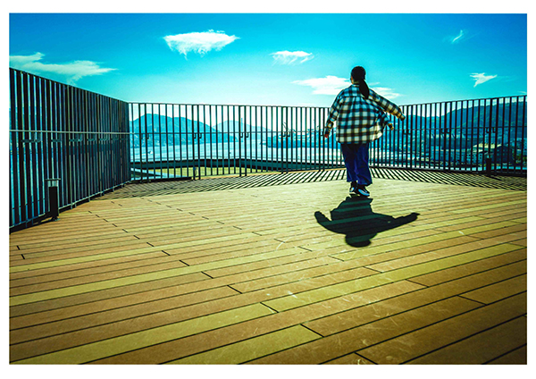 娘と一緒に学習室に行った時の休憩時間、展望室で無邪気にはしゃぐ娘をパシャリと撮った写真です。君がいるから私も頑張れる、私がめげずに頑張れているのは、貴方の笑顔とコツコツ頑張る姿を見ているから。今回の写真は、見栄えのする写真ではありませんが、感謝の気持ちを込めて、羽ばたいていく若者をイメージした仕上げをしました。また、上品かつしっかりとした表現のできる用紙を選択しプリントをしました。