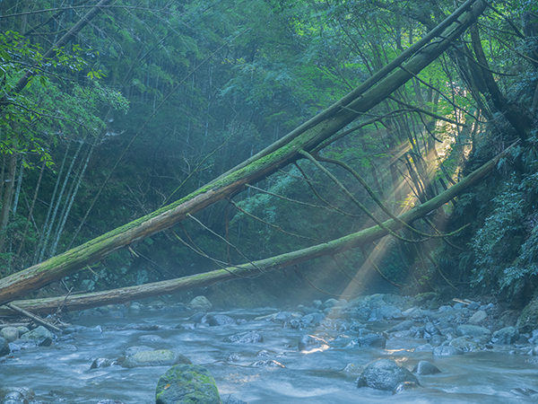 渓流に倒れた倒木と、そこに差し込む一筋の光が、森に宿る再生の瞬間を静かに照らしています。終わりに見える風景の奥に、新たに始まりと希望が確かに息づいていることを感じさせる作品です。