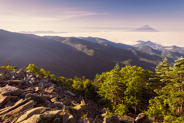 幾重にも連なる山々とその奥に広がる雲海と富士山に、大地の雄大なスケール感が伝わります。また手前の岩や森に光が差し込み、朝の空気感と自然の息遣いが感じられ、自然への畏敬の念を呼び起こす作品です。