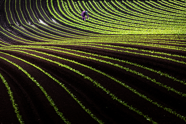 点景に畑の手入れをする農家さんを写し入れたことでスケールを感じます。長い日々の始まりですが、美しいラインに美味しさを予感させます。収穫後の笑顔も見たいですね。