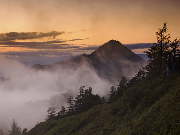 長野県志賀高原で10月の夕刻に撮った作品です。撮影地に着いた時はあたり一面雲に覆われ真っ白でした。しばらくすると雲が流れ始め、少しずつ晴れてきて周りの山々が見えてきて感動の瞬間でした。山の神様が夕暮れと相まって素晴らしい情景を見せてくれました。