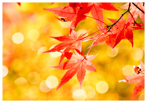 枝ぶりの良い真っ赤に染まったモミジを主役にしながら、背景の柔らかい黄色いボケの中に木漏れ日の丸ボケを上手く表現しています。光の捉え方やレンズの絞り値もちょうど良いです。またキラキラとした光の印象が光沢紙のプリントにマッチしていますね。