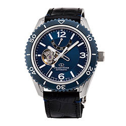 機械式ムーブメントの一部を見せるセミスケルトンをマリンブルーやライトシルバーが引き立て、大人の色気を感じさせるデザインに仕上がっています。